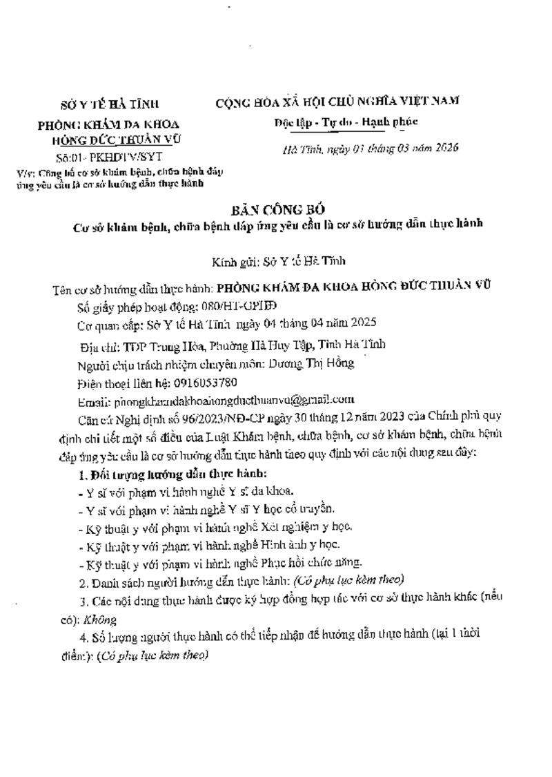 | Tiêu đề văn bản | Bản công bố cơ sở khám bệnh, chữa bệnh đáp ứng yêu cầu là cơ sở hướng dẫn thực hành. (Phòng khám Đa khoa Hồng Đức Thuần Vũ) | ||