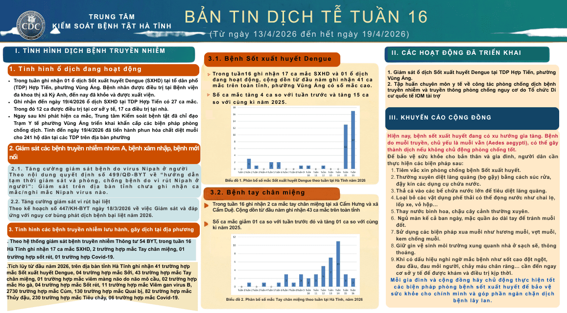Trong tuần ghi nhận 01 ổ dịch Sốt xuất huyết Dengue (SXHD) đang hoạt động tại tổ dân phố (TDP) Hợp Tiến, phường Vũng Áng. Ca bệnh đầu tiên của ổ dịch là 01 bệnh nhân nữ, 28 tuổi, lao động tự do, có triệu chứng khởi phát bệnh vào ngày 03/4/2026. Ngày 06/4/2026 đi khám và được xét nghiệm chẩn đoán mắc SXHD. Bệnh nhân được điều trị tại Bệnh viện đa khoa thị xã Kỳ Anh, đến nay đã khỏe và được xuất viện.