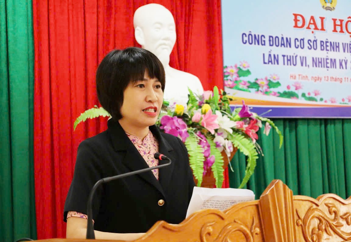 Phát biểu chỉ đạo, đồng chí Phan Thị Mai Hoa -Phó trưởng ban công đoàn khu kinh tế ghi nhận, biểu dương thành tích đạt được của Công đoàn cơ sở Bệnh viện Phổi Hà Tĩnh trong nhiệm kỳ qua, đặc biệt tổ chức tham quan học tập, khám sức khỏe định kỳ cho CBCNVC… đã thể hiện sự cố gắng của Ban chấp hành công đoàn trong việc vận động phối hợp ban chuyên môn. Đồng chí đề nghị trong nhiệm kỳ tới, Công đoàn tiếp tục phát huy vai trò đại diện, chăm lo, bảo vệ quyền, lợi ích hợp pháp của đoàn viên; tăng số lượng kết nạp Đảng viên; đoàn viên; phát huy hiệu quả hội nghị dân chủ đầu năm nhằm nâng cao thu nhập; kịp thời khen thưởng, biểu dương gương điển hình; gắn phong trào thi đua với nhiệm vụ chuyên môn, góp phần xây dựng tập thể bệnh viện đoàn kết, phát triển.