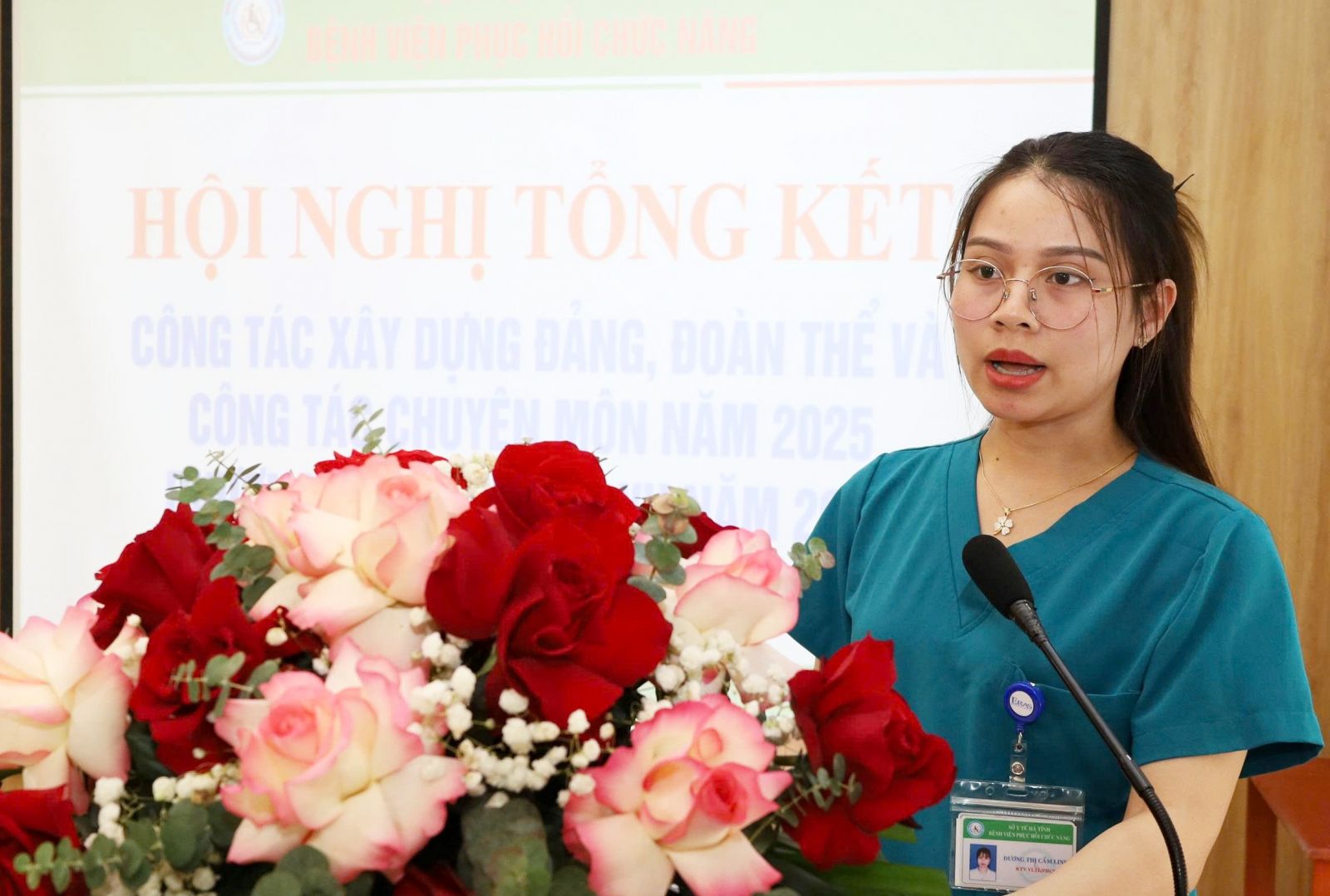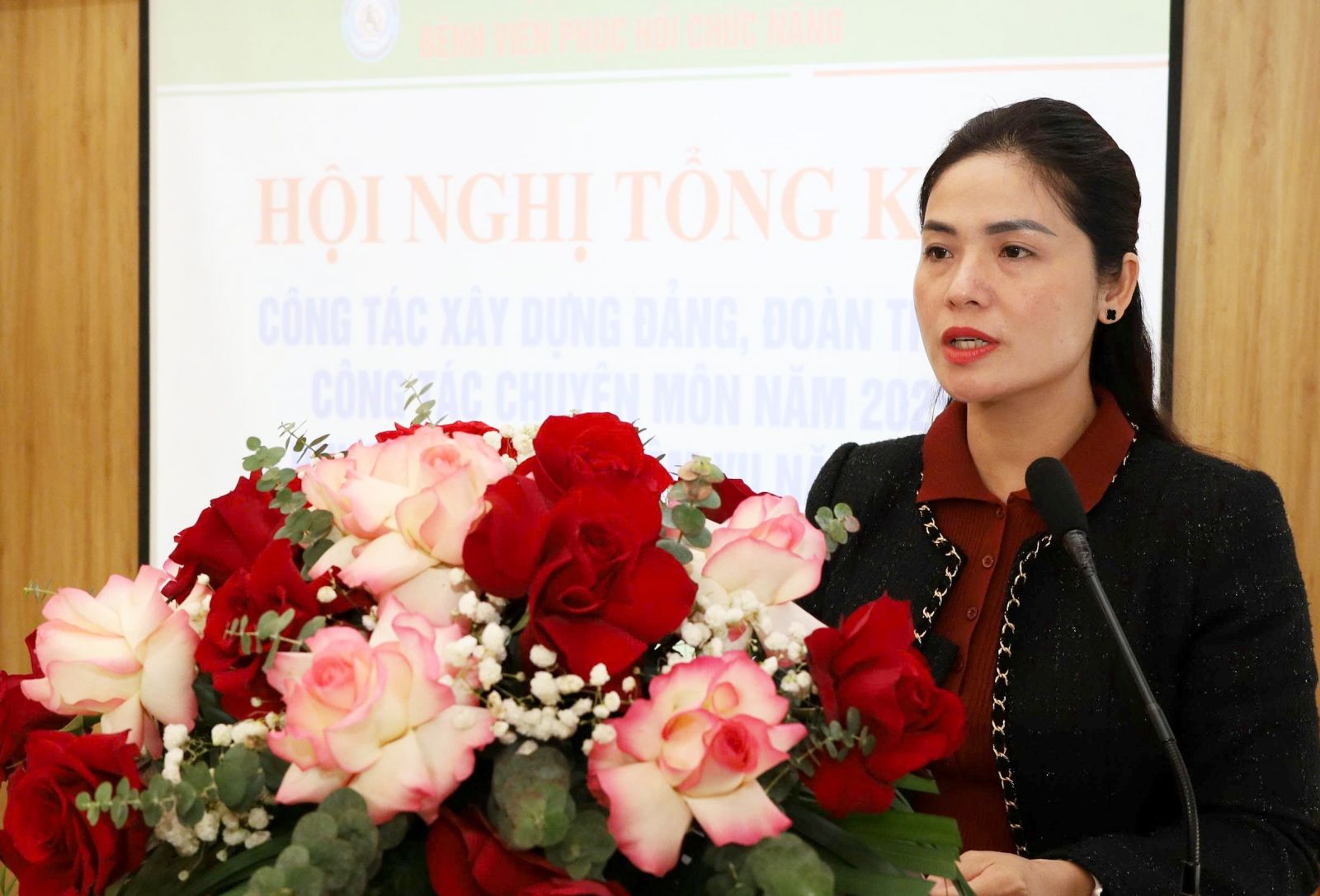 Bác sỹ Nguyễn Thị Diện, Bí thu Đảng bộ, Giám đốc Bệnh viện PHCN báo cáo công tác xây dựng Đảng và nhiệm vụ chuyên môn năm 2025