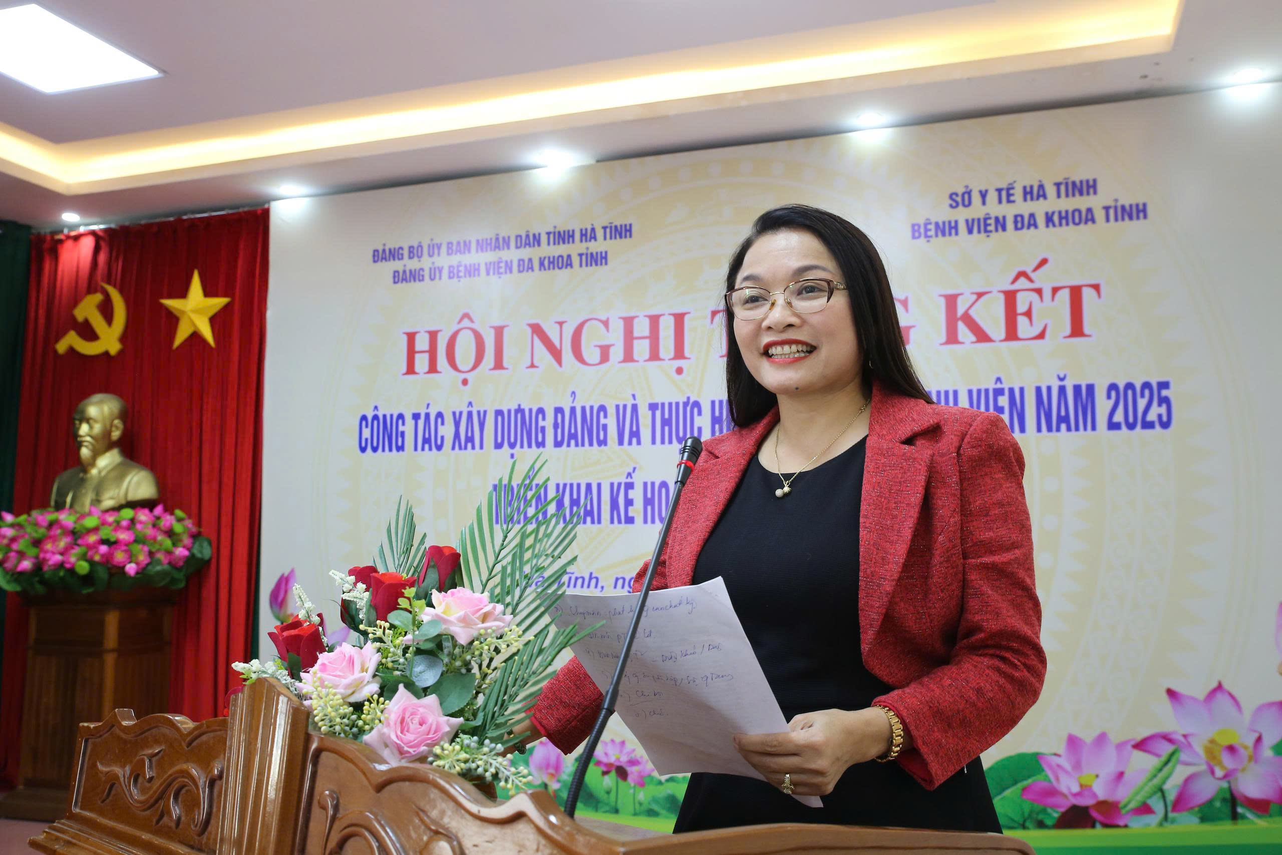 Phát biểu chỉ đạo tại hội nghị, Phó Bí thư chuyên trách Đảng ủy UBND tỉnh Nguyễn Thị Hà Tân ghi nhận, biểu dương những thành tích xuất sắc mà đơn vị đã đạt được trong năm 2025 vừa qua, tỉ lệ hài lòng trên 95% của người dân là minh chứng rõ nhất cho tinh thần "bệnh nhân là trung tâm" mà Đảng bộ đơn vị đã dày công xây dựng.