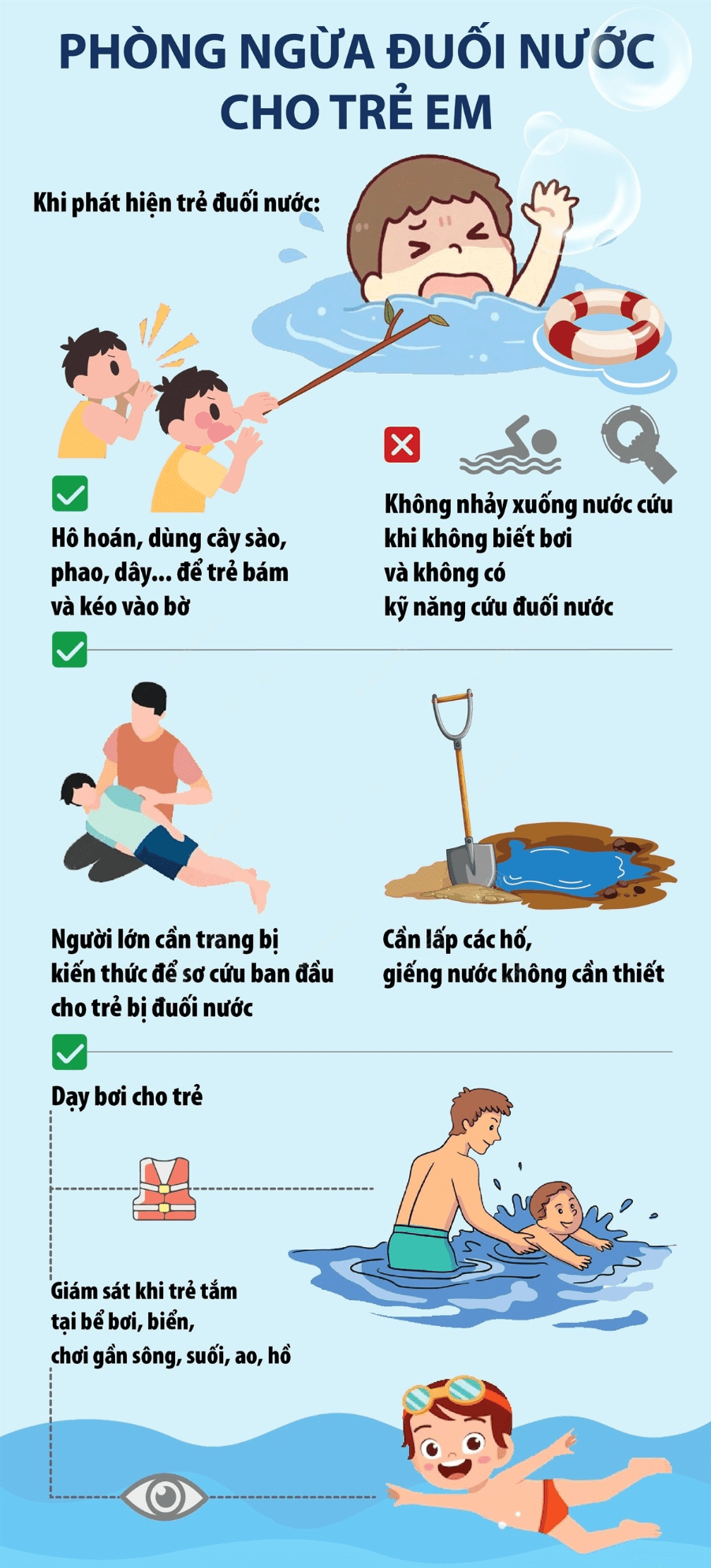 Đối với trẻ em: Không tự ý tắm sông, hồ; không rủ nhau đi bơi khi không có người lớn; tuân thủ quy tắc an toàn khi tham gia các hoạt động dưới nước.