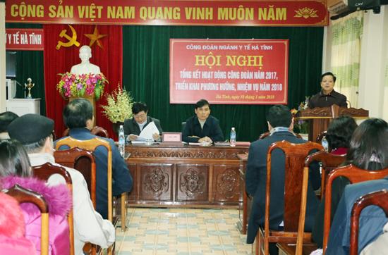 Phát biểu chỉ đạo tại Hội nghị, đồng chí Lê Văn Chí- Trưởng Ban Chính sách Pháp luật Liên đoàn Lao động tỉnh đánh giá cao những nỗ lực trong năm 2017 của các cấp công đoàn ngành Y tế trong việc thực hiện tốt chức năng, nhiệm vụ được giao; đã chăm lo, bảo vệ quyền và lợi ích hợp pháp chính đáng cho người lao động. Trong năm 2018, đồng chí đề nghị các CĐCS tổ chức tốt Hội nghị CBCNVC trong tháng một, tập trung thảo luận bàn bạc các giải pháp đẩy mạnh hoạt động chuyên môn của đơn vị. Bàn các giải pháp nâng cao thu nhập cho CBCNVC; lập danh sách rà soát đúng đối tượng để kịp thời hỗ trợ đoàn viên công đoàn có hoàn cảnh khó khăn. Đẩy mạnh các phong trào thi đua trước, trong và sau nhân dịp chào mừng Đại hội Công đoàn Hà Tĩnh lần thứ XVIII, nhiệm kỳ 2018-2023.