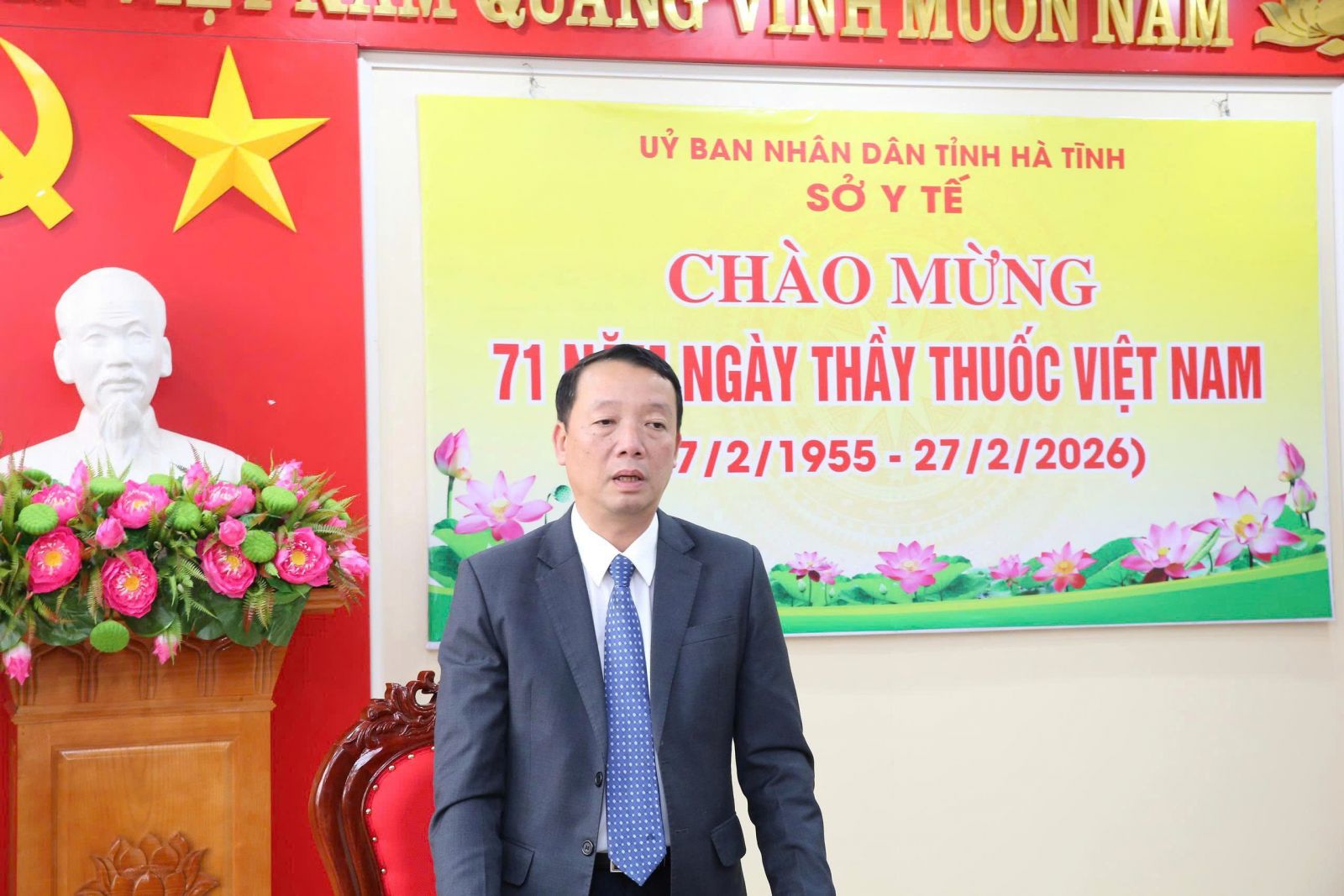 Tặng hoa chúc mừng các đơn vị: Sở Y tế; Bệnh viện Đa khoa tỉnh; Bệnh viện Phục hồi chức năng; Trung tâm Bảo vệ, chăm sóc sức khỏe cán bộ tỉnh và Trung tâm Kiểm soát bệnh tật tỉnh nhân kỷ niệm 71 năm Ngày Thầy thuốc Việt Nam, đồng chí Phan Thiên Định - Phó Bí thư Tỉnh ủy, Chủ tịch UBND tỉnh gửi lời chúc mừng tốt đẹp nhất đến toàn thể cán bộ, y bác sỹ và nhân viên của ngành.