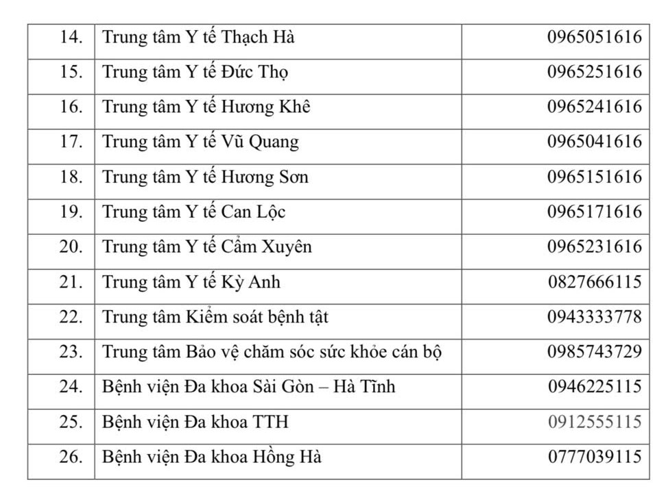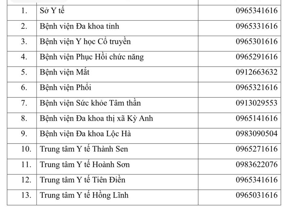 Thực hiện chỉ đạo của Tỉnh ủy, UBND tỉnh Hà Tĩnh về công tác chủ động phòng, chống và khắc phục hậu quả cơn bão số 10, Sở Y tế Hà Tĩnh vùa có thông báo số điện thoại đường dây nóng của các đơn vị y tế trên địa bàn tỉnh gửi các sở, ban, ngành, đoàn thể cấp tỉnh; UBND các xã, phường; các cơ sở y tế trên địa bàn tỉnh; các cơ quan thông tin, truyền thông, các cơ quan, tổ chức, cá nhân và Nhân dân liên hệ khi có sự cố, tình huống khẩn cấp cần hỗ trợ y tế trước, trong và sau bão, điện thoại cụ thể như sau: