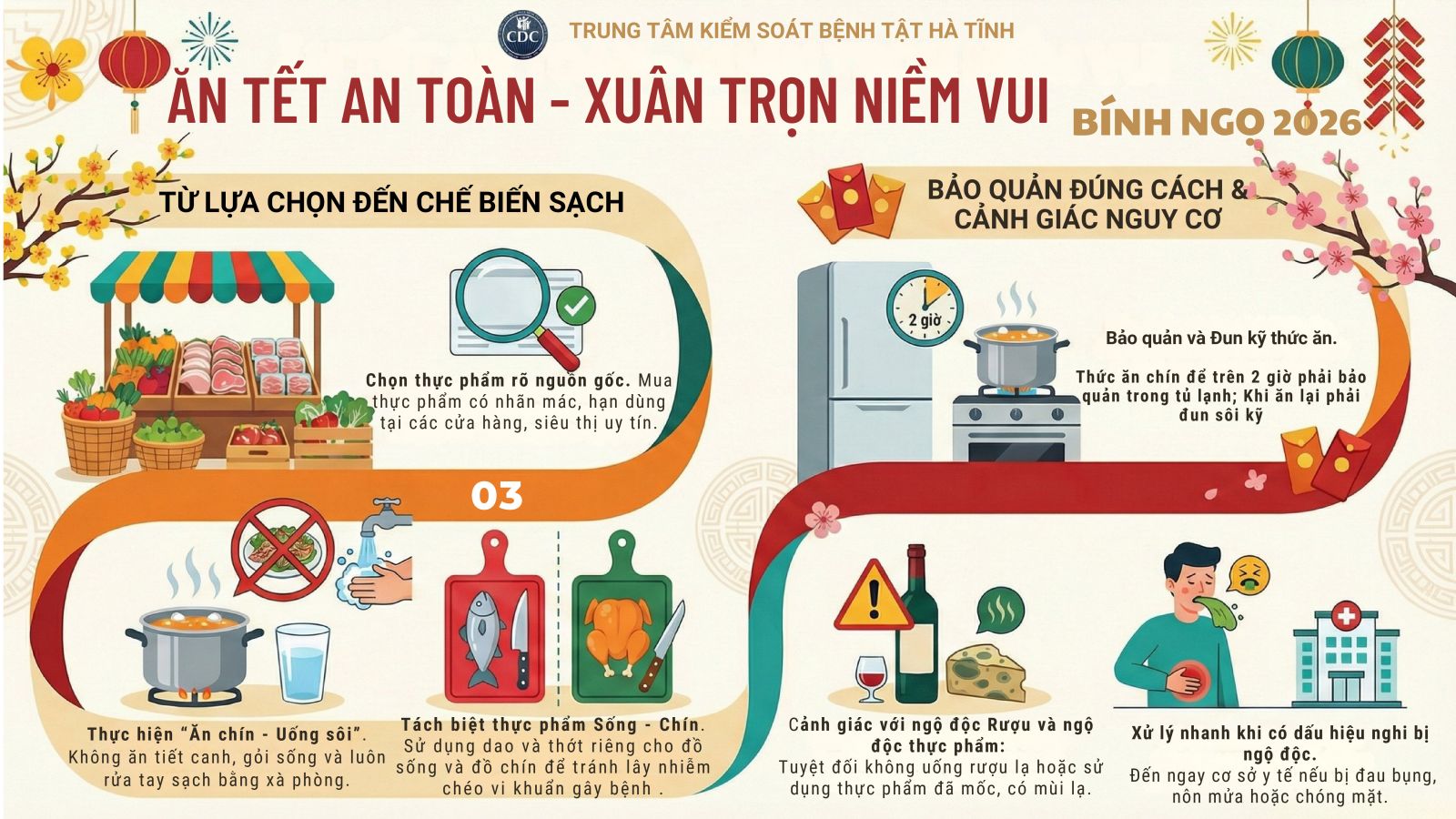 Sở Y tế cũng yêu cầu công tác báo cáo về bảo đảm ATTP phải được duy trì nghiêm túc, đúng quy định. Các hoạt động trên nhằm chủ động kiểm soát nguy cơ ô nhiễm thực phẩm, phòng ngừa ngộ độc, bảo vệ sức khỏe Nhân dân, góp phần bảo đảm cho người dân đón Tết Nguyên đán và tham gia các lễ hội xuân năm 2026 an toàn, lành mạnh.