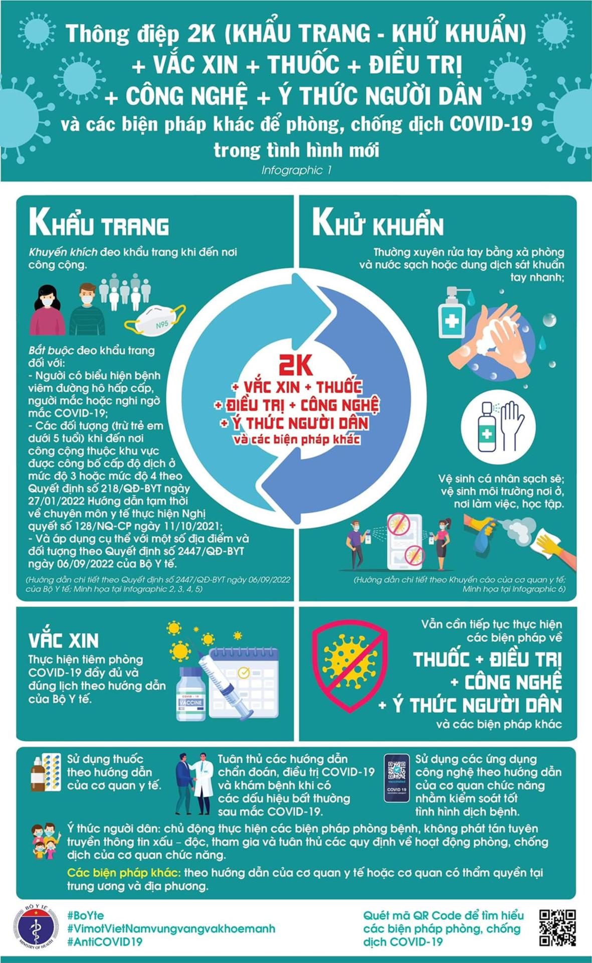 Theo đó, Bộ Y tế thông báo sửa đổi thông điệp 5K thành 2K gồm khẩu trang, khử khuẩn. Cùng đó, Bộ Y tế cũng kêu gọi người dân tiêm vaccine COVID-19 đầy đủ và đúng lịch theo hướng dẫn của Bộ Y tế, kết hợp "thuốc + điều trị + công nghệ + ý thức" trong phòng chống dịch.