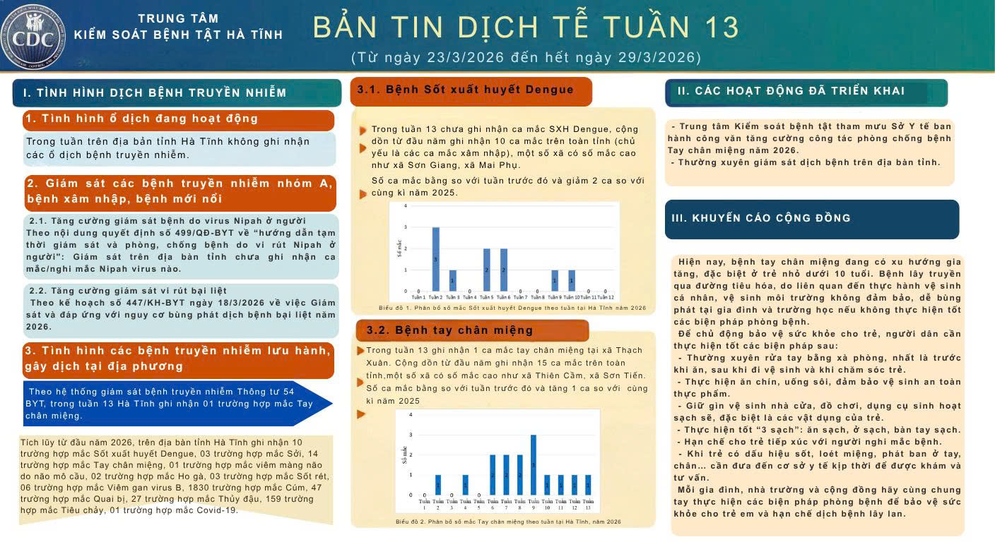Tích lũy từ đầu năm 2026, trên địa bàn tỉnh Hà Tĩnh ghi nhận 10 trường hợp mắc Sốt xuất huyết Dengue, 03 trường hợp mắc Sởi, 15 trường hợp mắc Tay chân miệng, 01 trường hợp mắc viêm màng não do não mô cầu, 02 trường hợp mắc Ho gà, 03 trường hợp mắc Sốt rét, 06 trường hợp mắc Viêm gan virus B, 1830 trường hợp mắc Cúm, 47 trường hợp mắc Quai bị, 27 trường hợp mắc Thủy đậu, 159 trường hợp mắc Tiêu chảy, 01 trường hợp mắc Covid-19.
