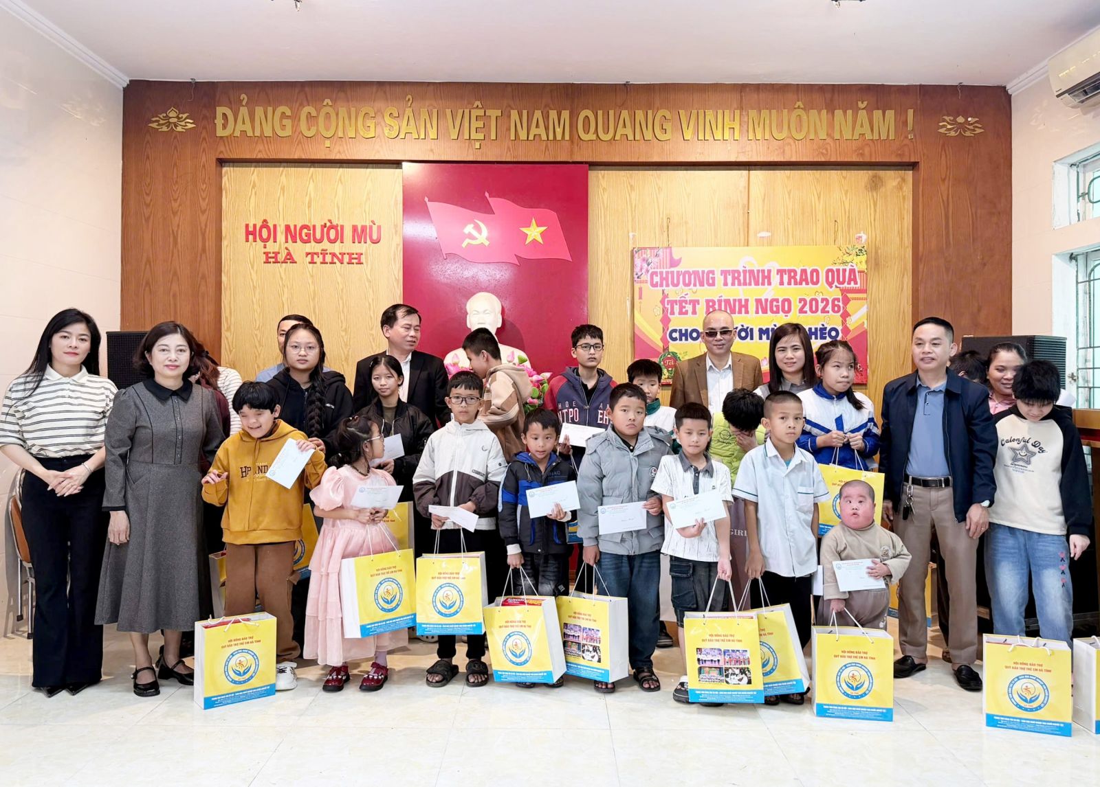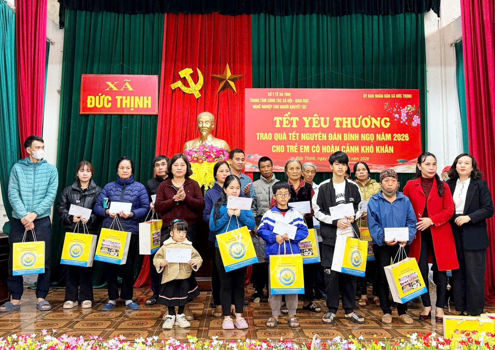 Nhân dịp Tết Nguyên đán Bính Ngọ 2026, trong hai ngày 5–6/2, Trung tâm Công tác xã hội – Giáo dục nghề nghiệp cho người khuyết tật (Sở Y tế Hà Tĩnh) đã trao tặng 150 suất quà cho trẻ em có hoàn cảnh khó khăn đang điều trị tại Bệnh viện Đa khoa tỉnh, Bệnh viện Phục hồi chức năng Hà Tĩnh; các em nhỏ thuộc Hội Người mù Hà Tĩnh; học sinh Trường THCS Nam Hà (phường Thành Sen) và trẻ em tại các xã Đức Thịnh, Mai Hoa, Hương Bình, Hà Linh. Tham dự chương trình có bác sĩ Bùi Quốc Hùng – Phó Giám đốc Sở Y tế Hà Tĩnh.