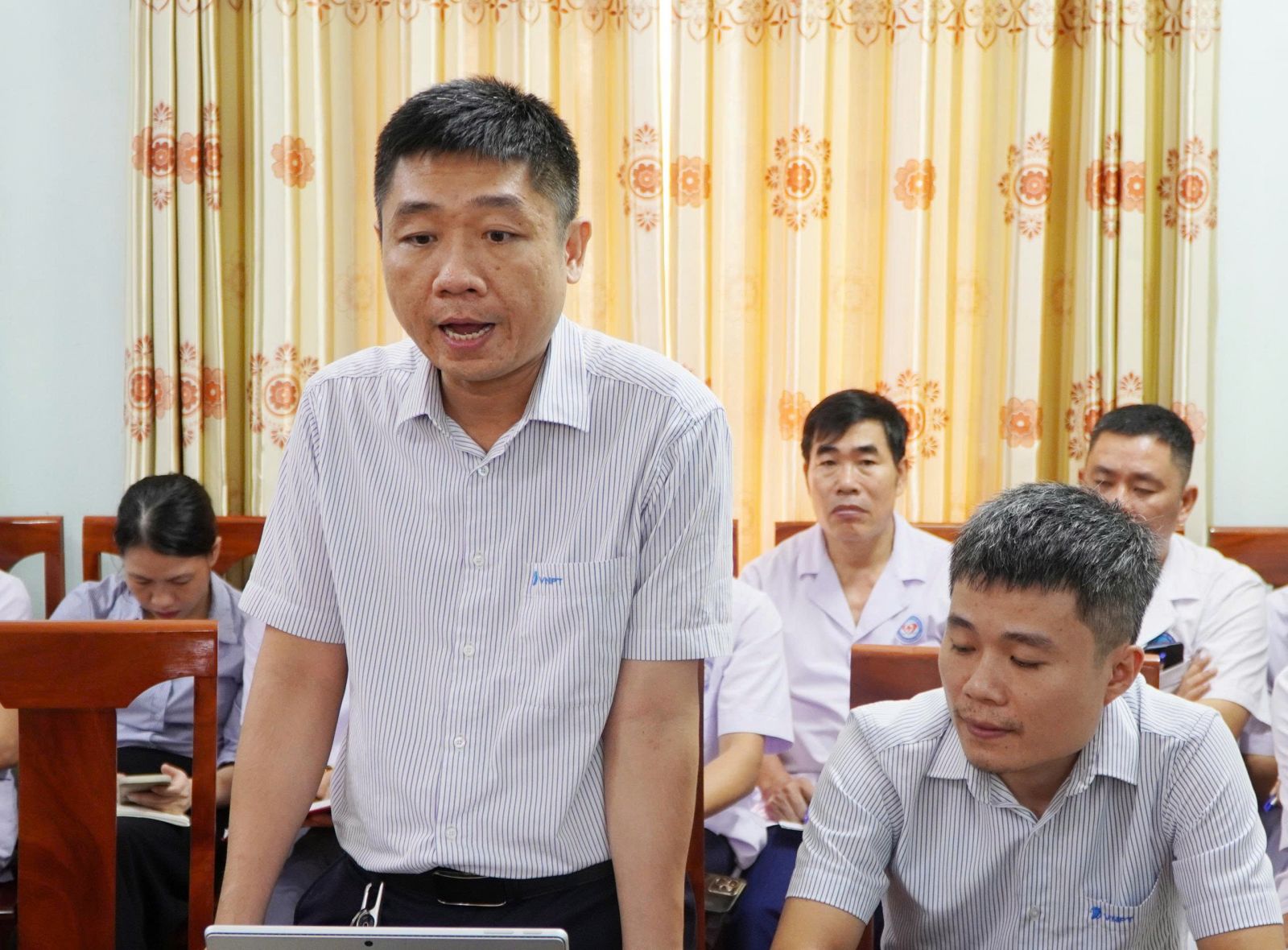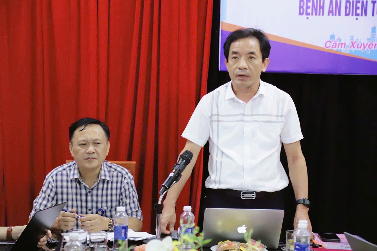 Bác sỹ Nguyễn Phúc Long, Giám đốc Trung tâm Y tế Cẩm Xuyên báo cáo công tác thực hiện EMR tại đơn vị
