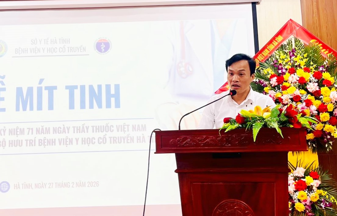 Chiều ngày 27/2/2026, Bệnh viện Y học cổ truyền Hà Tĩnh tổ chức Lễ mít tinh và gặp mặt cán bộ qua các thời kỳ nhằm ôn lại truyền thống vẻ vang, đồng thời tri ân các thế hệ cán bộ đã có nhiều đóng góp cho sự phát triển của đơn vị. Tham dự buổi lễ có Ban Giám đốc Bệnh viện, lãnh đạo các khoa, phòng, cùng các đồng chí nguyên lãnh đạo, cán bộ hưu trí qua các thời kỳ.