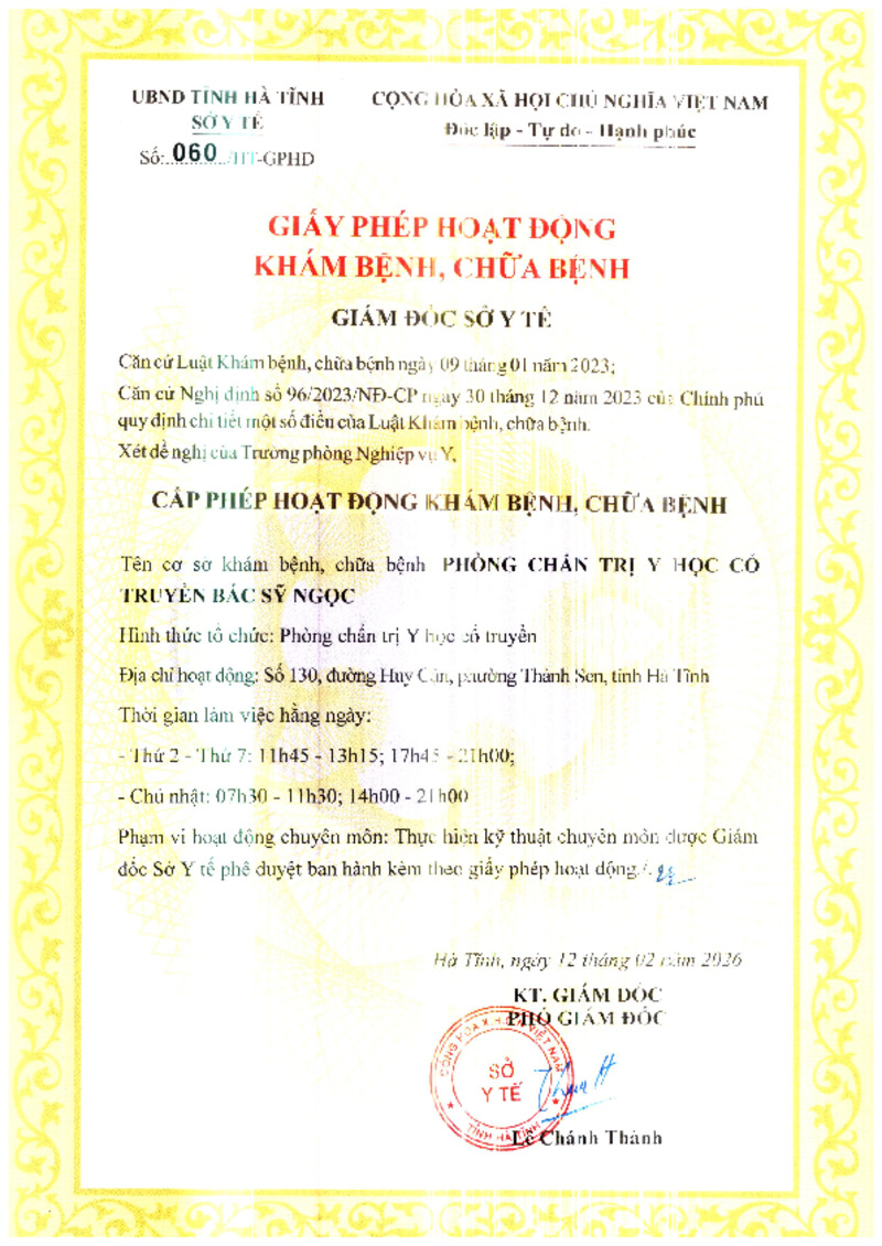 | 12 | 529/HT-GPHĐ | 02/02/2026 | Phòng Chẩn trị YHCT Lê Thị Tính |