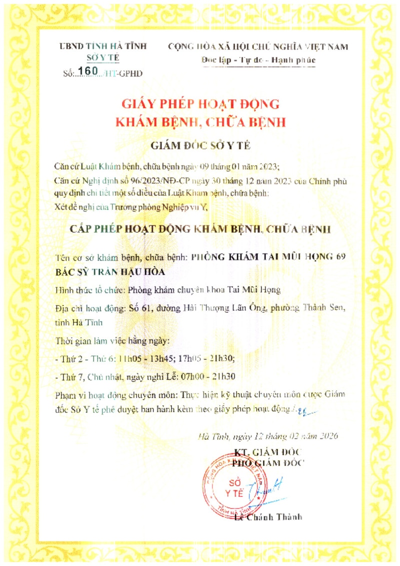 | 2 | 007/HT-GPHĐ | 06/02/2026 | Phòng Chẩn trị YHCT Trần Văn Thư | |