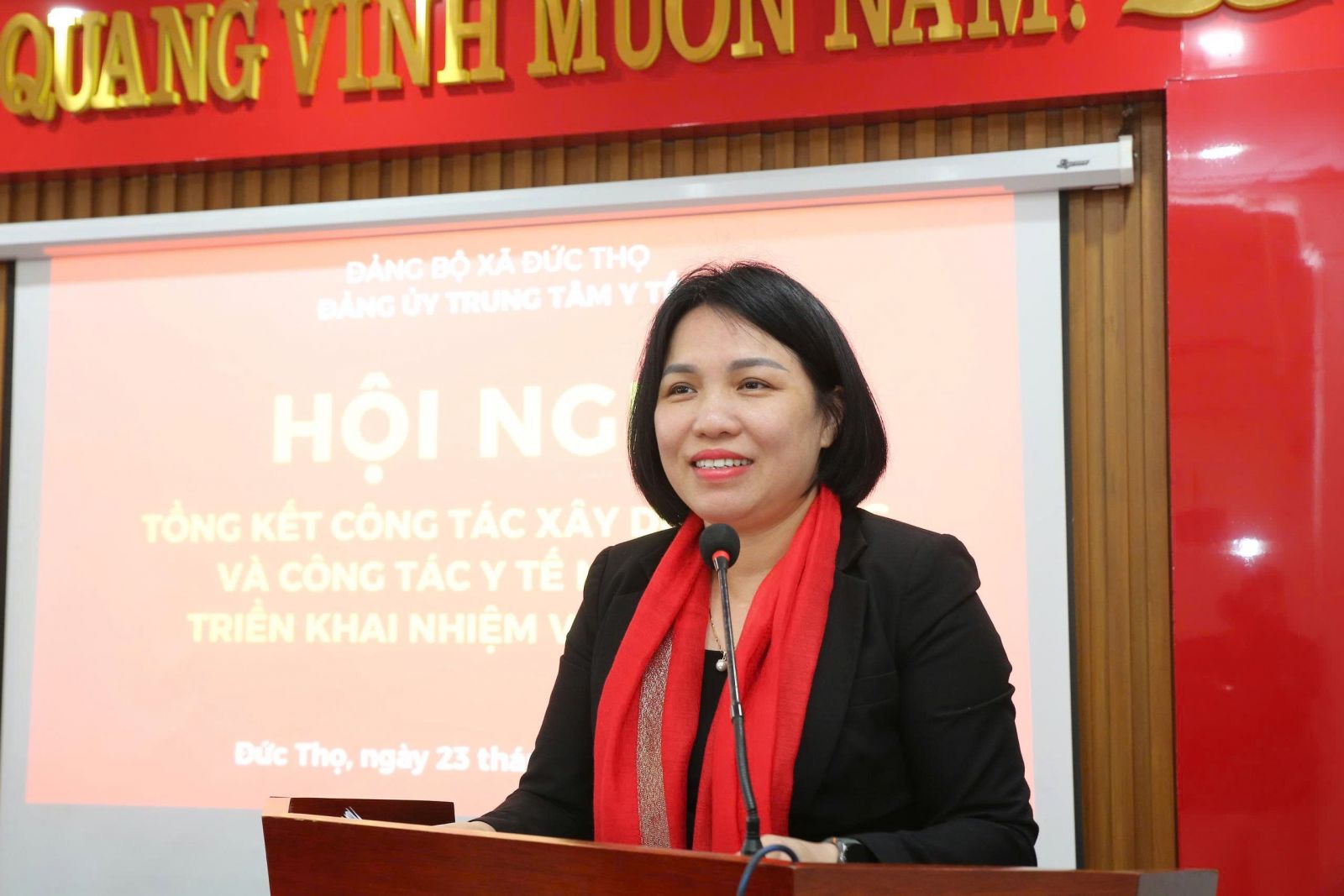 Đồng chí Đường Thị Phú - Phó Bí thư thường trực Đảng bộ xã Đức Thọ : “Biểu dương, ghi nhận những kết quả mà Đảng bộ Trung tâm Y tế Đức Thọ đạt được trong thời gian qua, nhất là công tác giáo dục chính trị tư tưởng, đoàn kết nội bộ trong đơn vị”.